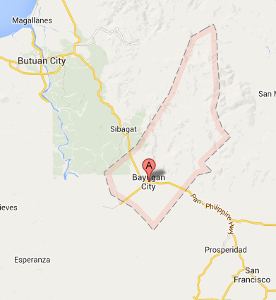 Bayugan is a city in the province of Agusan del Sur. According to the NSO Census of 2010, the city has a population of 99,361 distributed in a total land area of 505.00 square kilometers (194.98 sq mi). The City is classified as a third class city according to The Local Government Code of 1991 (Republic Act No. 7160).