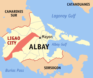 Ligao City is a fourth class city in the province of Albay. It is located 500 kilometres (310 mi) south-east of Manila. According to the 2010 census, it has a population of 104,914 people distributed in a total land area of 246.75 square kilomters (95.27 sq mi).